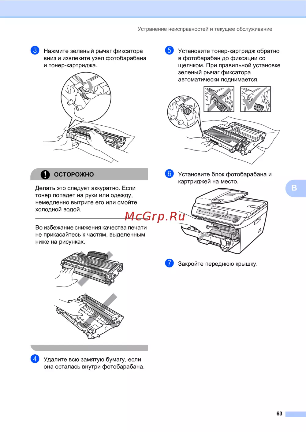 Узнайте, как правильно устранять неисправности и обслуживать печатающие устройства. Следуйте инструкциям для безопасной замены тонера и фотобарабана.