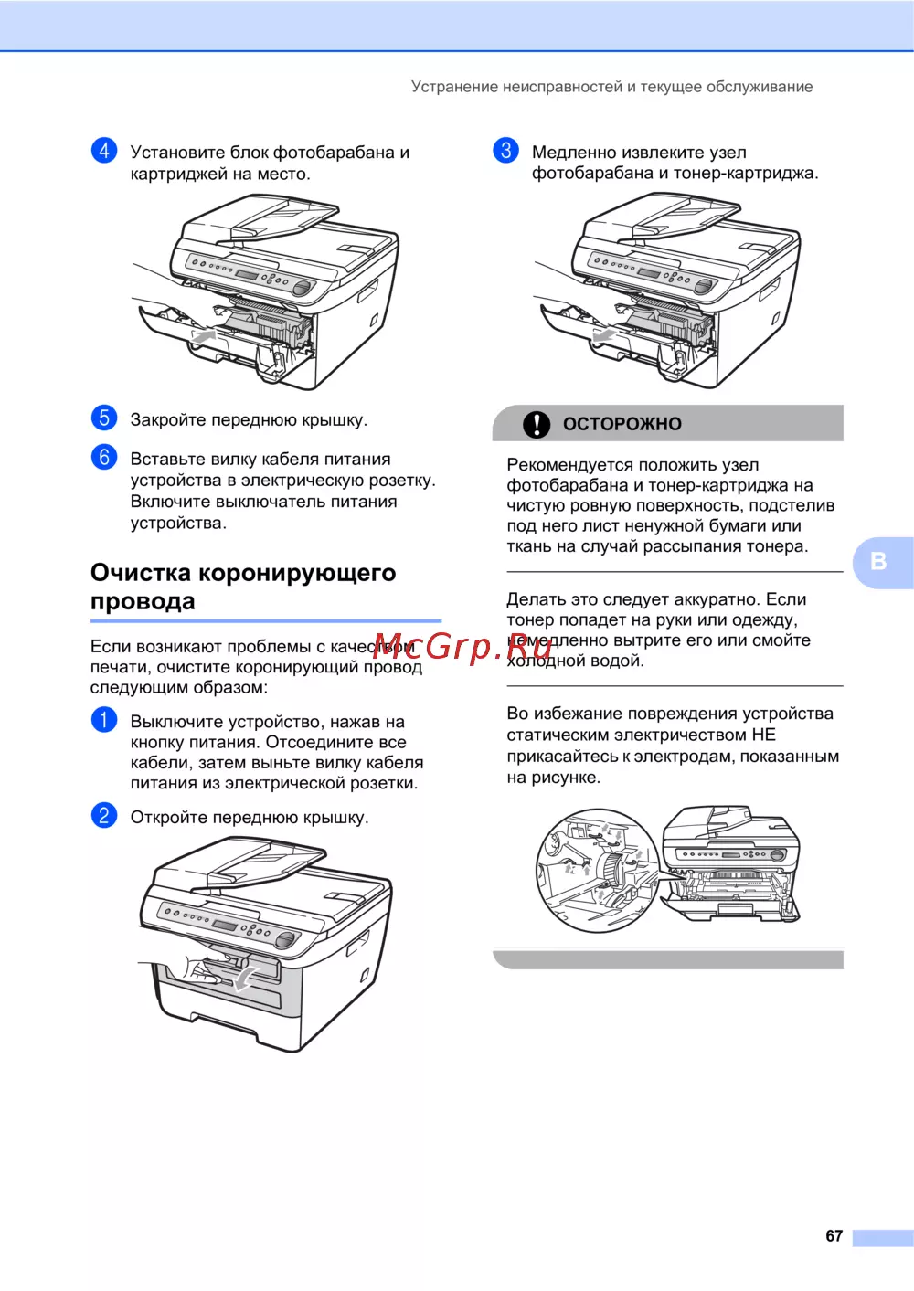 Научитесь устранять неисправности и обслуживать печатающие устройства. Узнайте, как правильно установить фотобарабан и очистить коронирующий провод для улучшения качества печати.