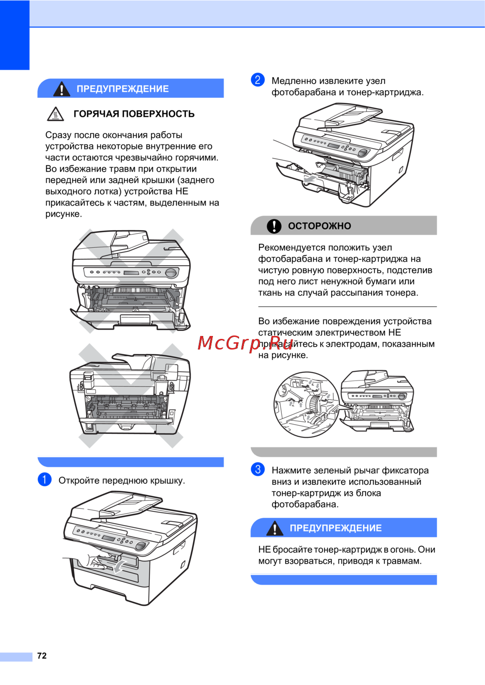 Узнайте, как безопасно извлекать узел фотобарабана и тонер-картриджа, избегая травм от горячих поверхностей и статического электричества.
