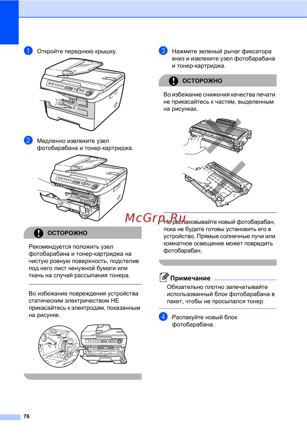 Узнайте, как правильно заменить фотобарабан и тонер-картридж. Следуйте простым шагам для предотвращения повреждений и обеспечения качественной печати.