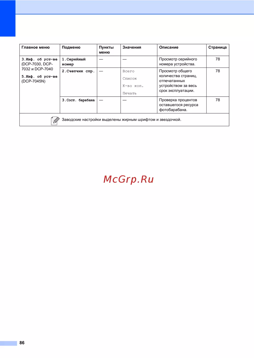 - Заводские настройки выделены жирным шрифтом и звездочкой p.88