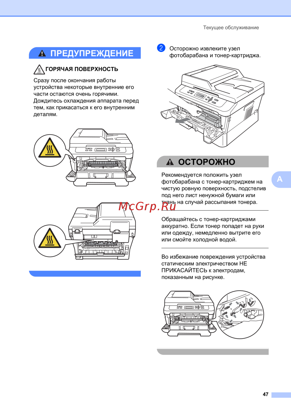 Узнайте, как правильно обслуживать устройство и заменять тонер-картриджи. Следуйте рекомендациям по безопасности и уходу за аппаратом для предотвращения повреждений.