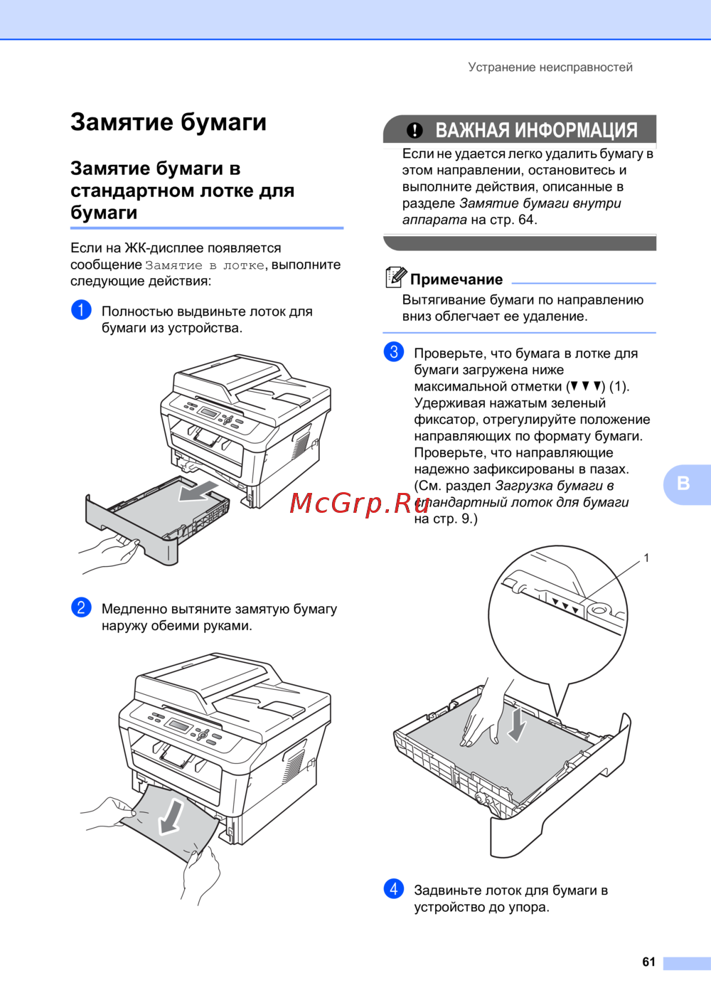 Узнайте, как устранить замятие бумаги в стандартном лотке. Следуйте простым шагам для безопасного удаления бумаги и правильной загрузки в устройство.