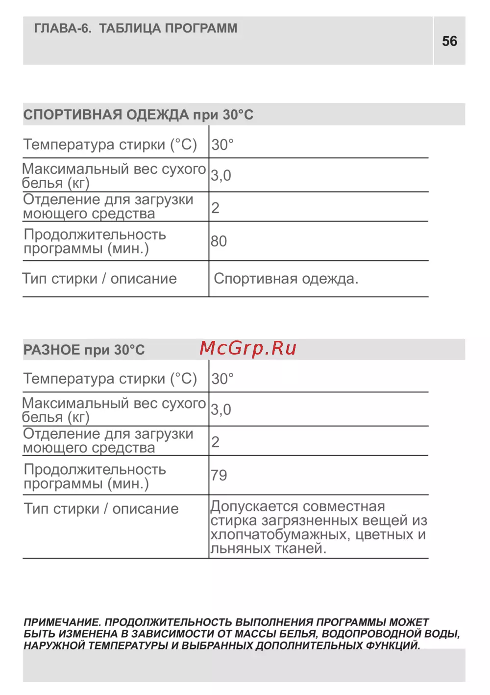 Schaub Lorenz SLW MW6110 — программы стирки спортивной одежды при 30°C: подробности и особенности [56/78]