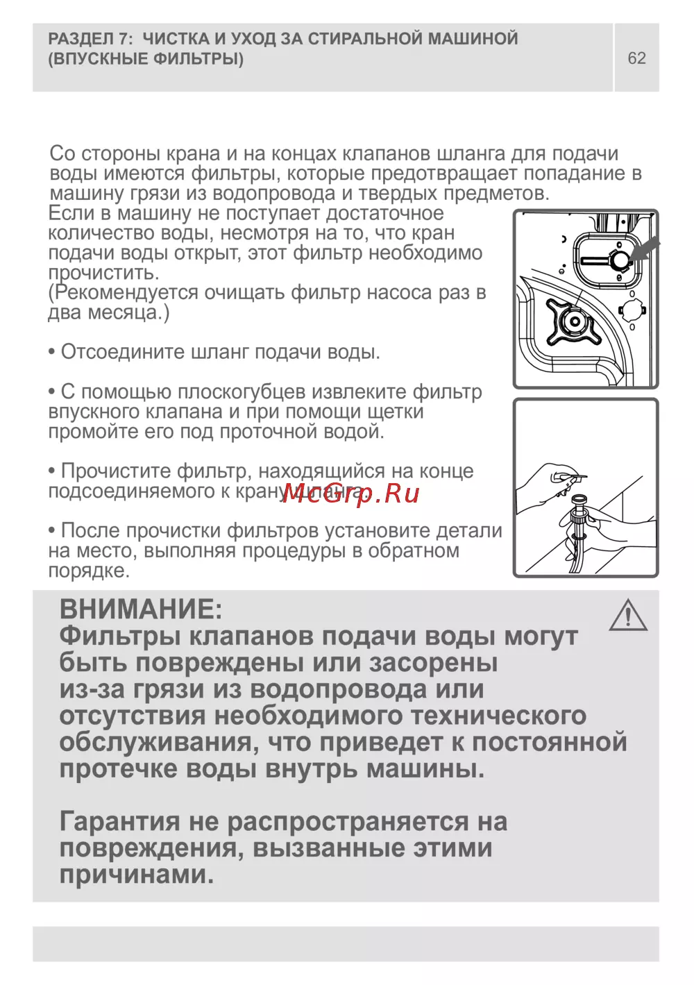 - Внимание фильтры клапанов подачи воды могут быть повреждены или засорены из за грязи из водопровода или отсутствия необходимого технического обслуживания что приведет к постоянной протечке воды внутрь машины p.62