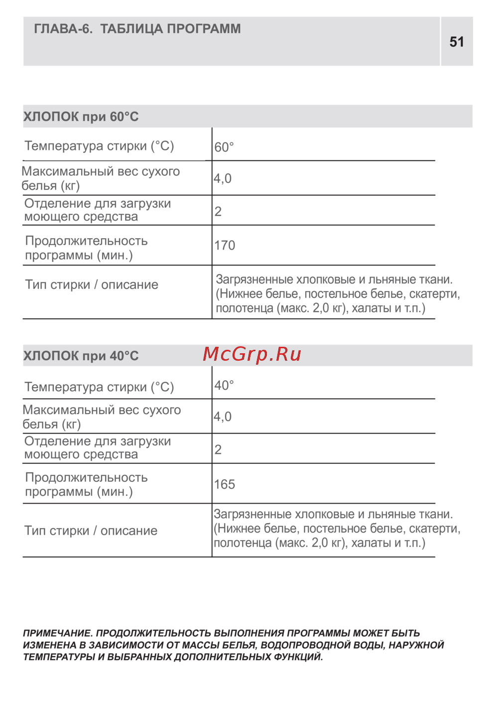 Узнайте о различных программах стирки, их продолжительности и условиях выполнения. Подробности о температуре, типах тканей и максимальном весе белья.