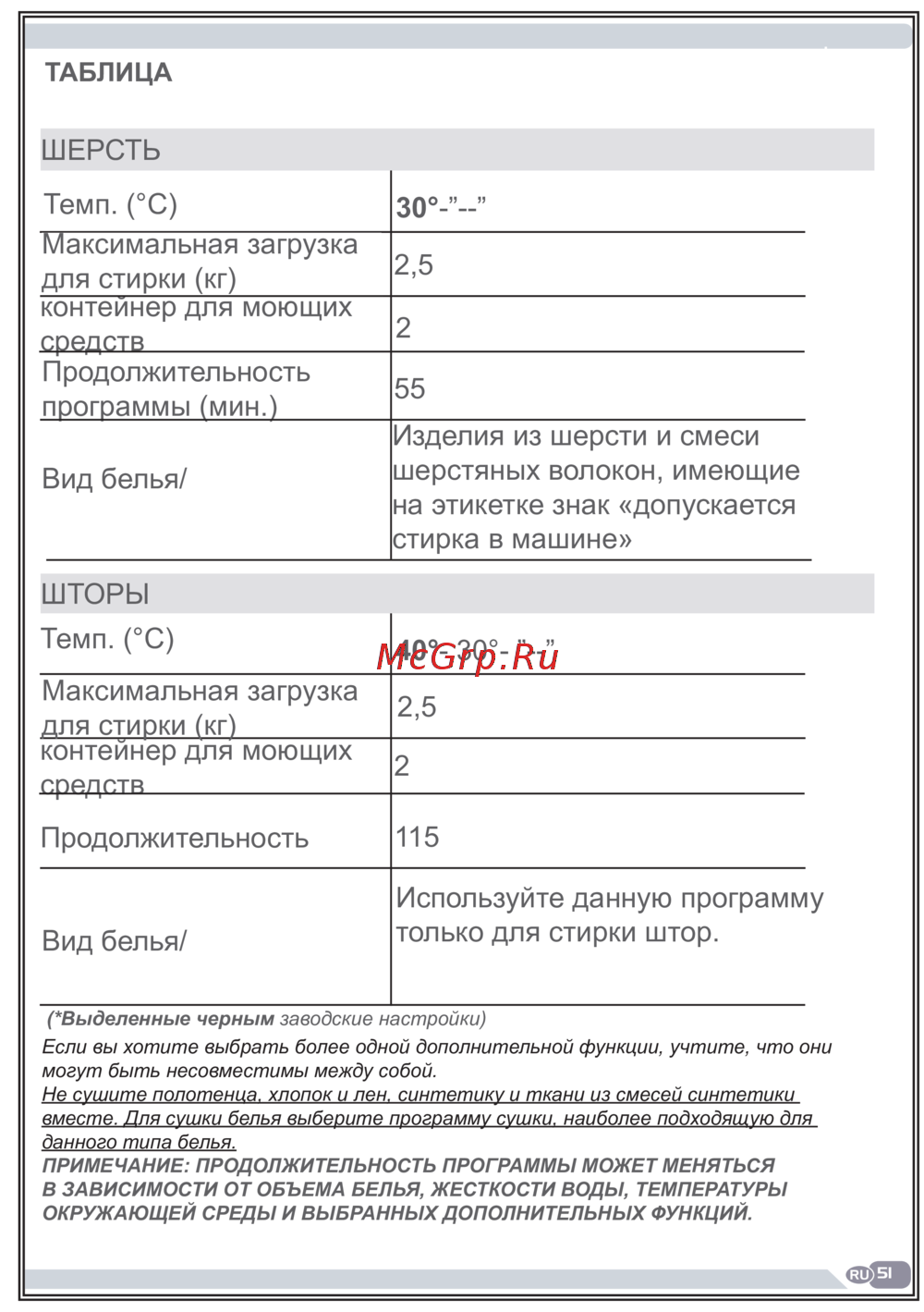 - Выбор уровня сушки см таблицу выбора для уровня и продолжительности сушки p.43
