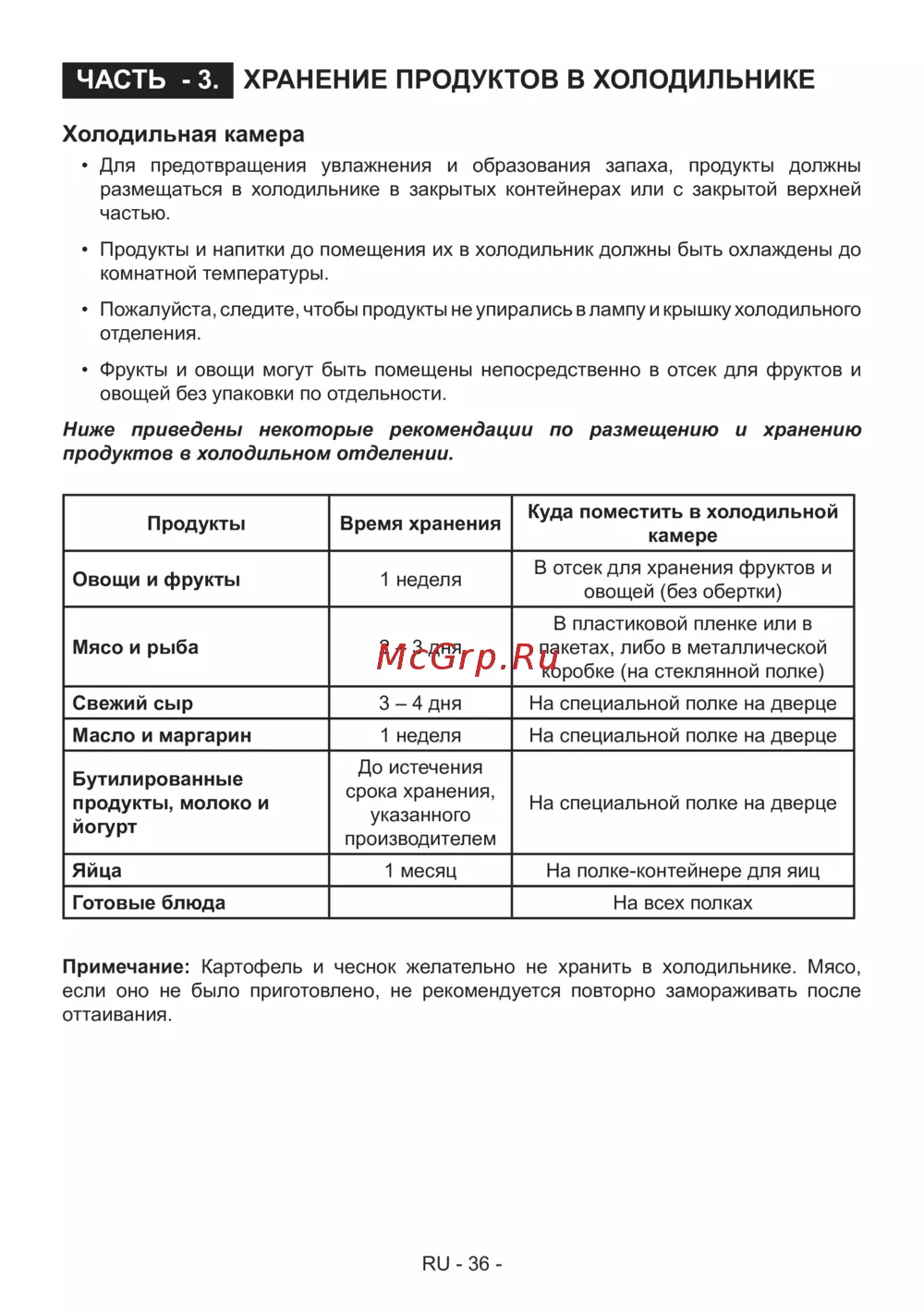 Примечание: Картофель и чеснок желательно не хранить в холодильнике. Мясо,