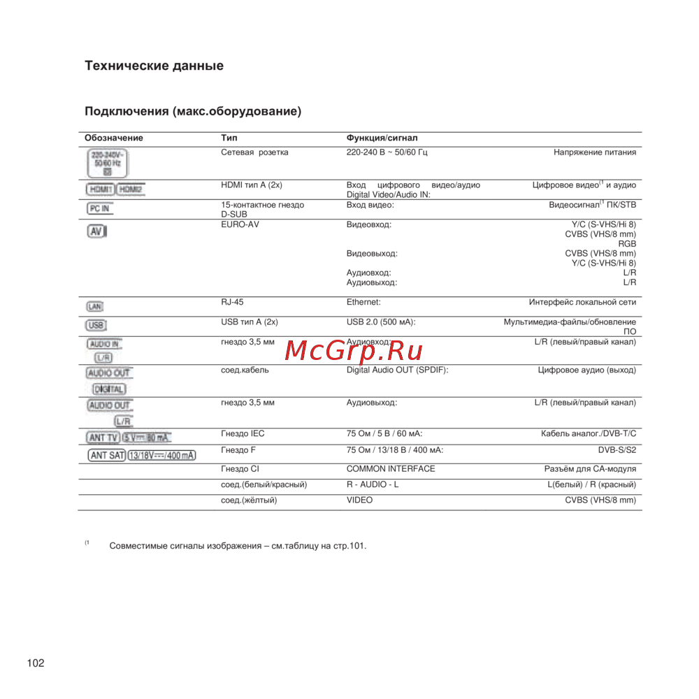 - Электрические характеристики сигналы поступающие по pc in hdmi p.101