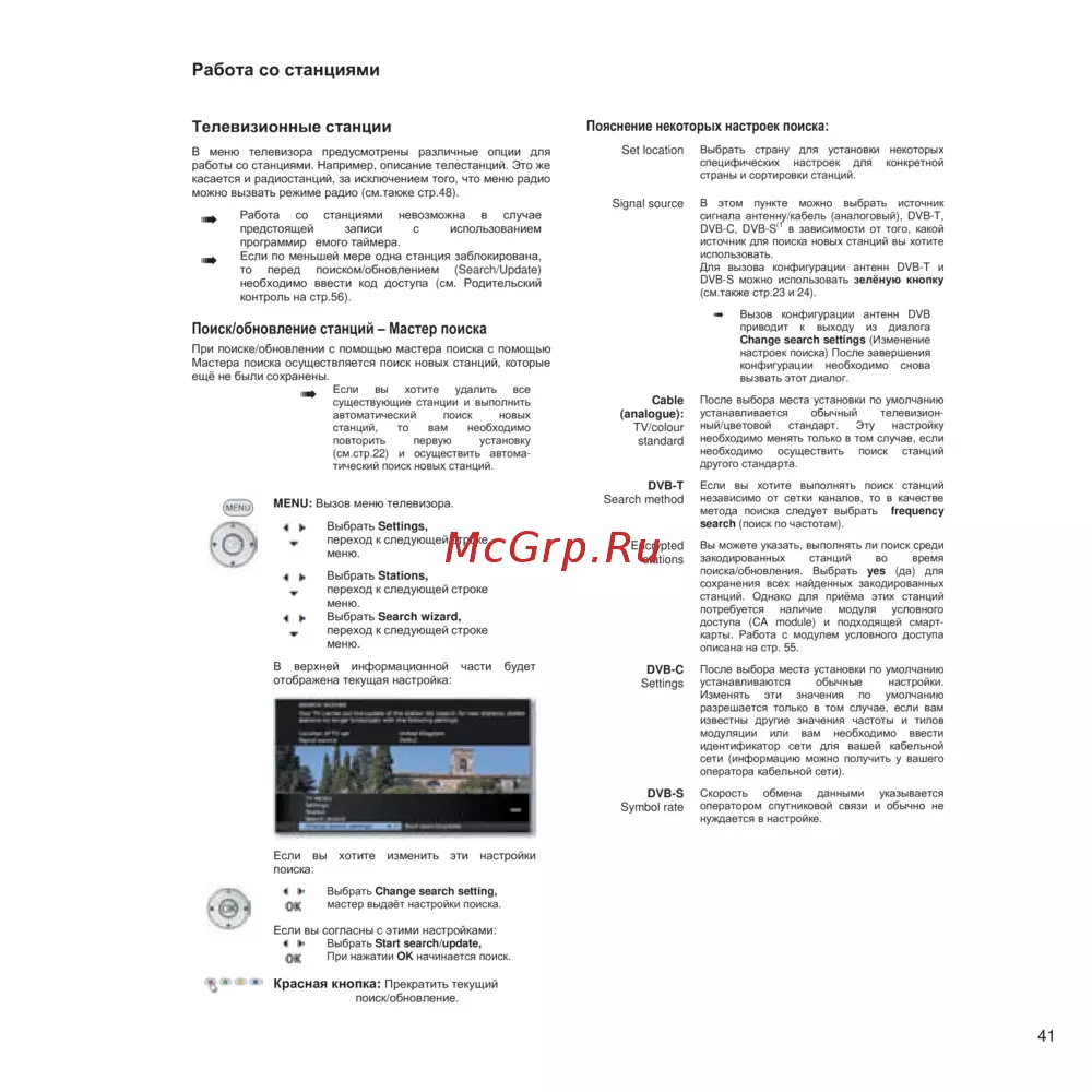 Узнайте, как эффективно работать с телевизионными и радиостанциями, используя меню поиска и настройки. Получите советы по обновлению и удалению станций.