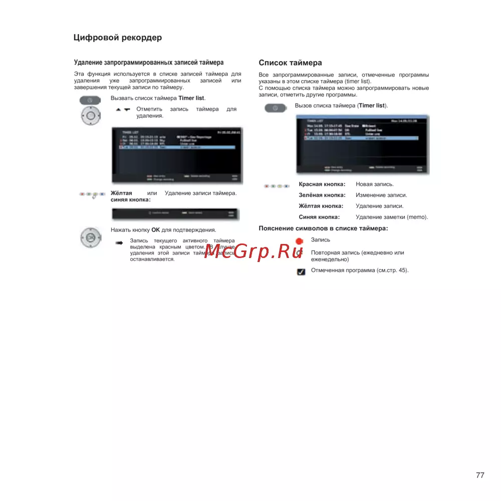 Пояснение символов в списке таймера: