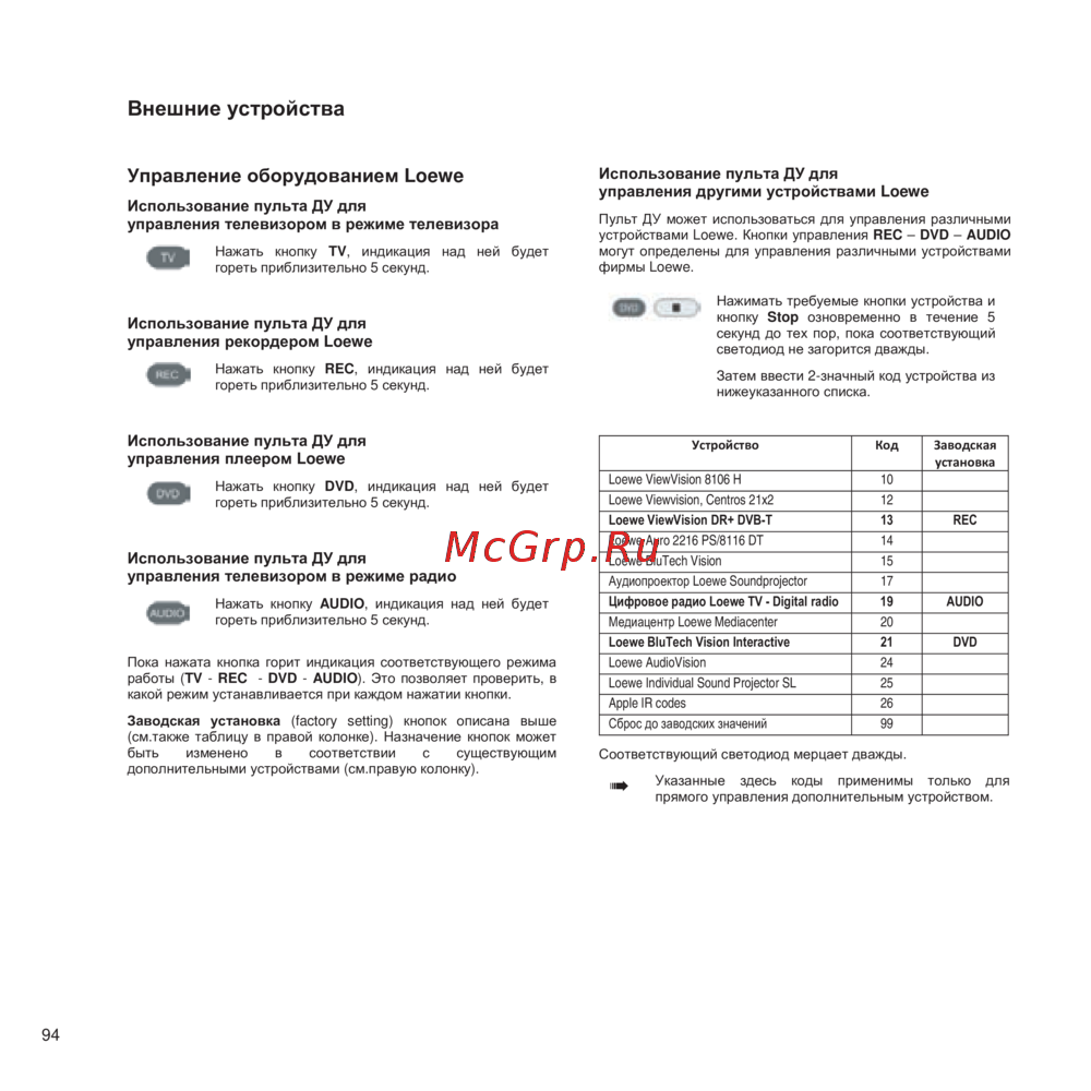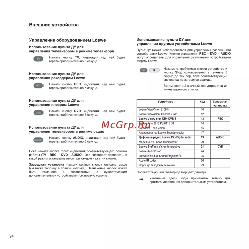 - Использование пульта ду для управления другими устройствами loewe p.94