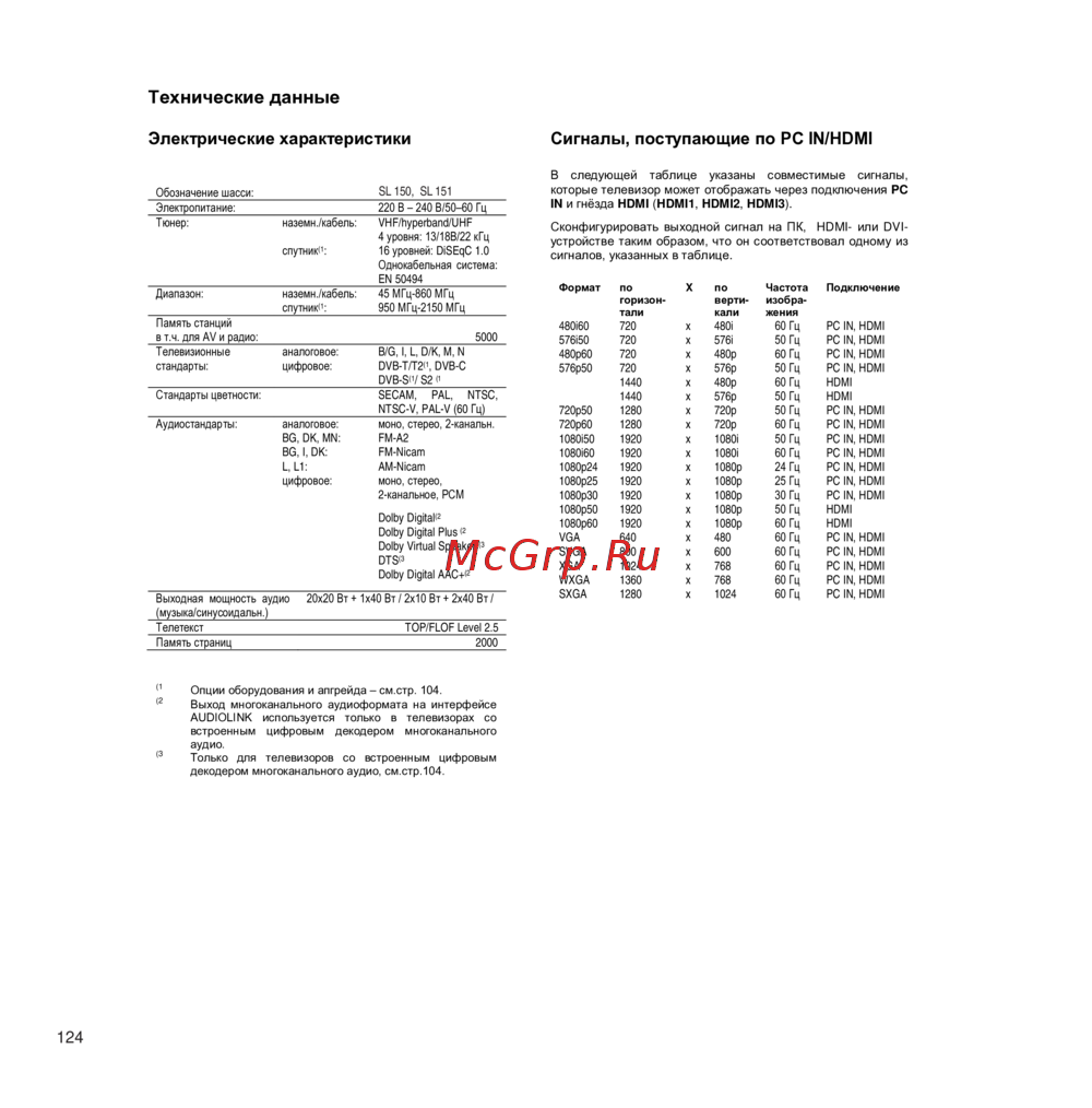- Электрические характеристики сигналы поступающие по pc in hdmi p.124