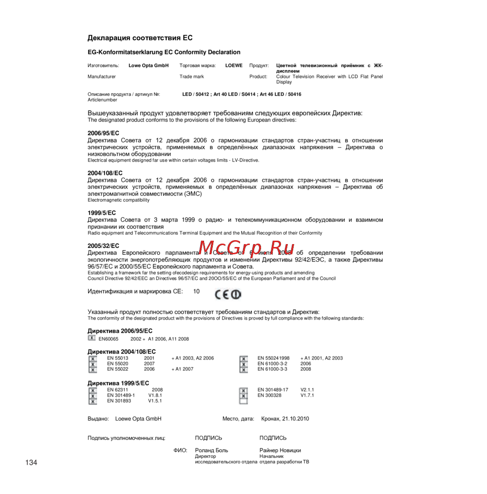 Выдано: Loewe Opta GmbH Место, дата: Кронах, 21.10.2010