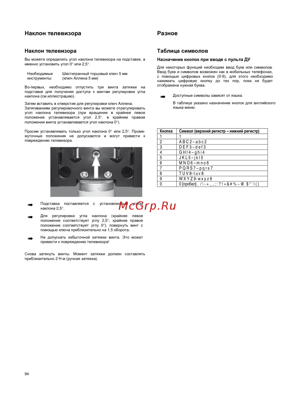 - Наклон телевизора разное p.94