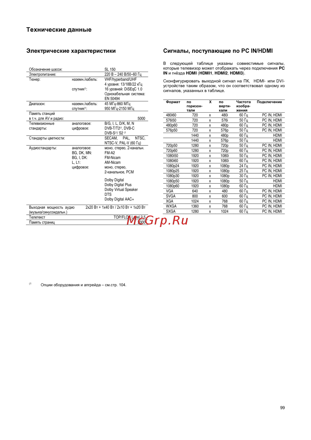 - Электрические характеристики сигналы поступающие по pc in hdmi p.99