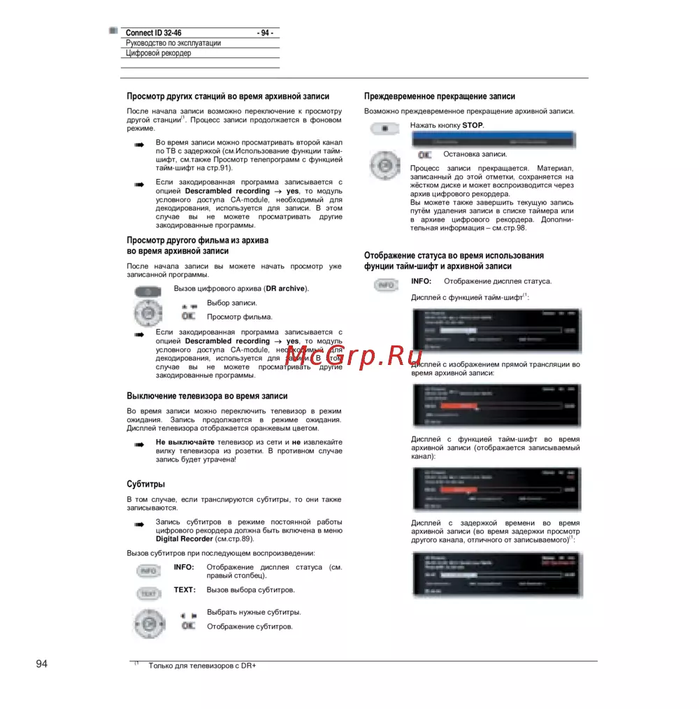 Узнайте, как использовать цифровой рекордер для записи и просмотра программ. Инструкции по архивной записи, тайм-шифту и работе с субтитрами.