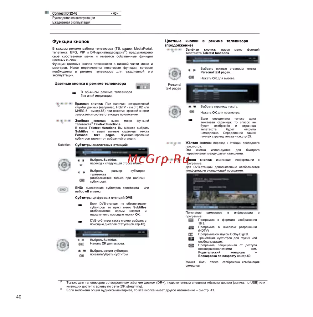 Узнайте о функциях цветных кнопок и меню в режиме телевизора. Подробное руководство по ежедневной эксплуатации и использованию телетекста и субтитров.