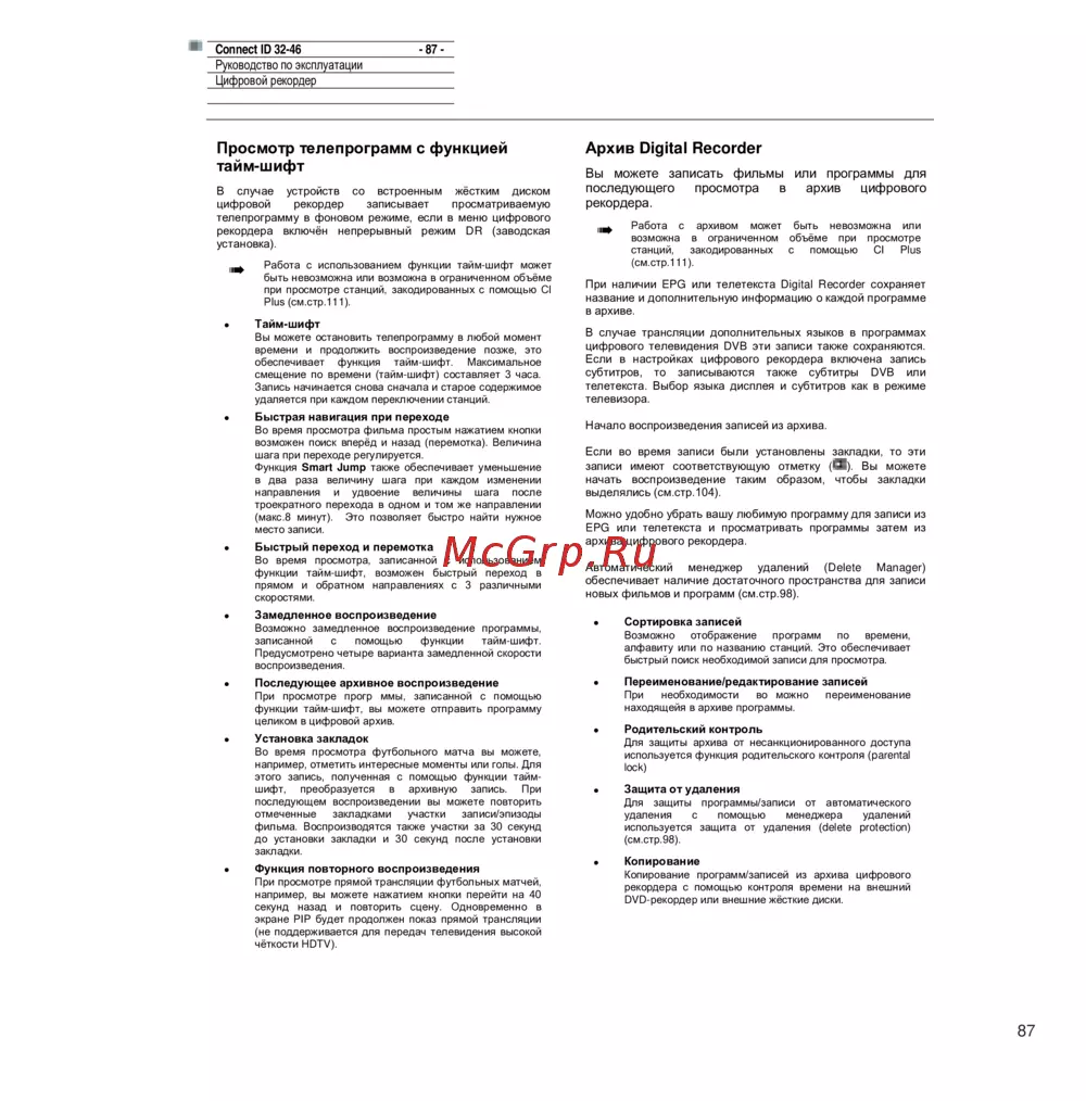 Узнайте, как использовать цифровой рекордер с функцией тайм-шифт для записи и воспроизведения телепрограмм. Подробности о навигации, архивировании и настройках.