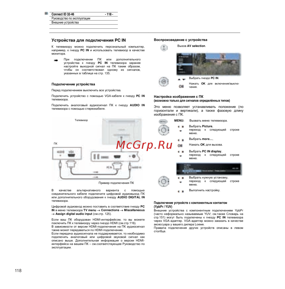стр.151) могут быть подключены к гнезду PC IN телевизора