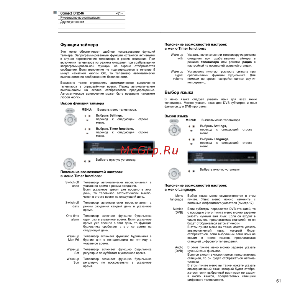 Узнайте, как использовать функции таймера вашего телевизора для автоматического включения и выключения. Настройте будильник и выберите язык меню для удобства.