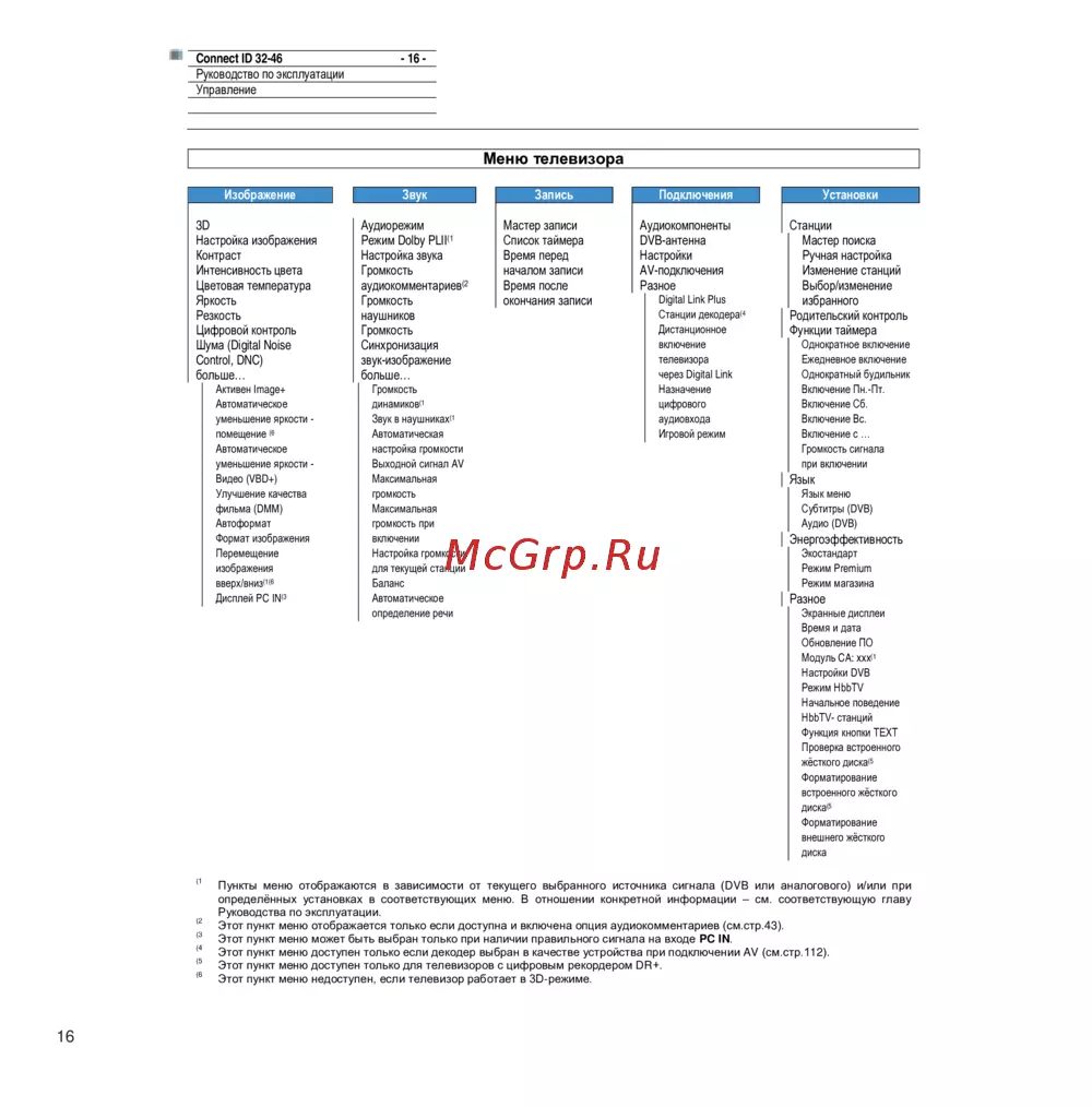 Изучите руководство по эксплуатации телевизора, включая управление изображением, звуком и настройками. Узнайте о функциях, таких как запись и родительский контроль.