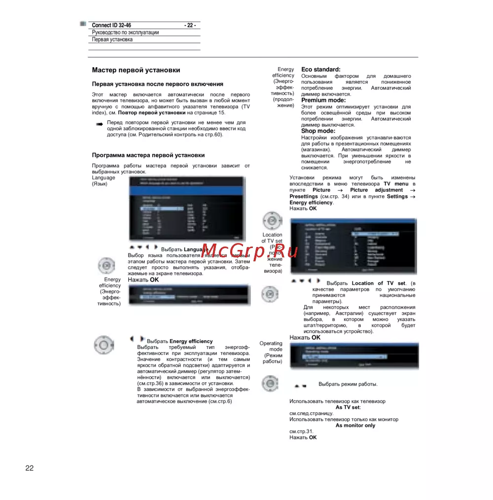 Узнайте, как правильно выполнить первую установку телевизора, включая выбор языка, расположения и режимов работы для оптимальной энергоэффективности.