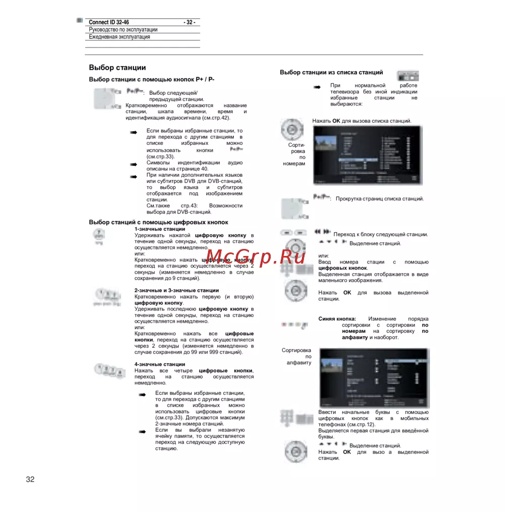 Инструкция по выбору телепрограмм с помощью кнопок P+/P-, цифрового ввода, сортировки по номерам и алфавиту. Поддержка избранных станций, DVB и языков.