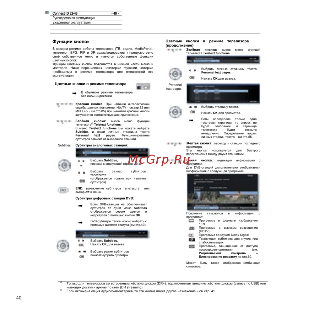 Изучите функции цветных кнопок и меню телевизора для ежедневной эксплуатации. Узнайте, как использовать телетекст, субтитры и другие возможности.
