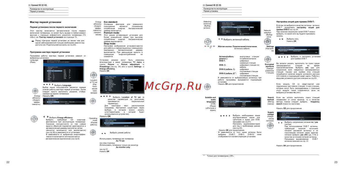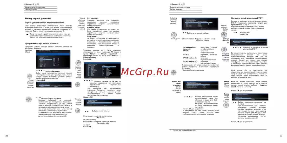 Узнайте, как правильно выполнить первую установку телевизора, выбрать язык, настроить энергоэффективность и подключить антенну для приема каналов.