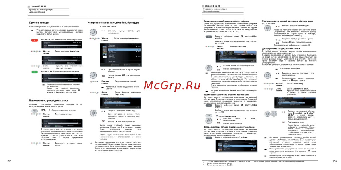 Узнайте, как управлять закладками, копировать записи и воспроизводить их с внешнего жесткого диска. Полное руководство по функциям цифрового рекордера.