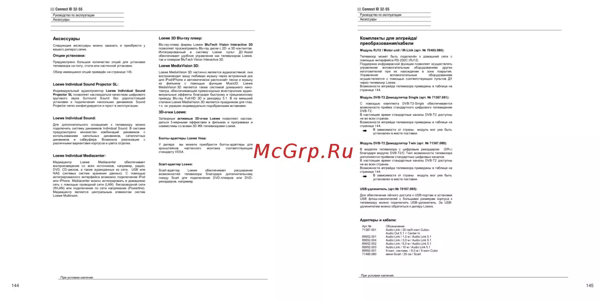 Руководство по аксессуарам Loewe: системы звука, медиапроектор, плеер, 3D-система и аксессуары для установки. Информация о доступных опциях и приобретении у дилера.