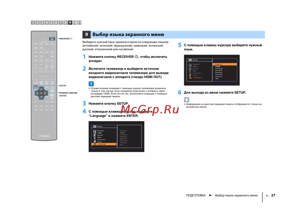ПОДГОТОВКА ➤ Выбор языка экранного меню Ru 27