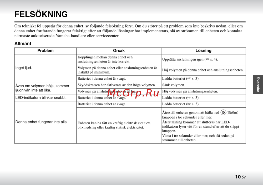 ![Yamaha NX-P100 Black [61/132] Om tekniskt fel uppstår för denna enhet se följande felsökning först om du stöter på ett problem som inte beskrivs nedan eller om denna enhet fortfarande fungerar felaktigt efter att följande lösningar har implementerats slå av strömmen till enheten och kontakta närmaste auktoriserade yamaha handlare eller servicecenter](/views2/1271888/page61/bg3d.png)