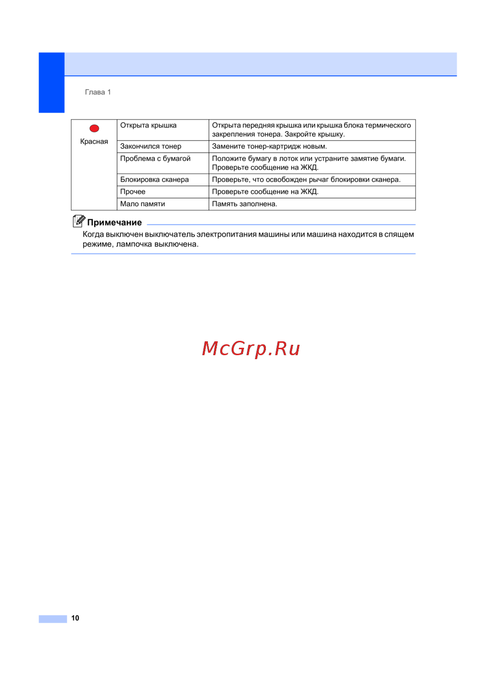 - Когда выключен выключатель электропитания машины или машина находится в спящем режиме лампочка выключена p.20
