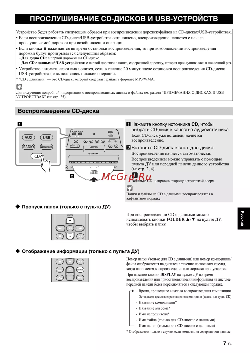 Узнайте, как правильно воспроизводить CD-диски и USB-устройства, управлять воспроизведением и получать информацию о дорожках и файлах. Подробная инструкция для пользователей.