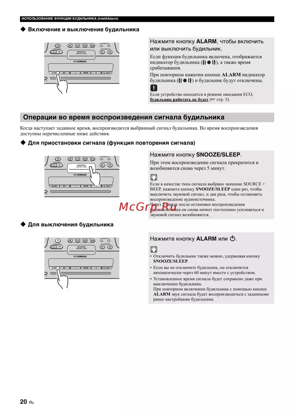 - Когда наступает заданное время воспроизводится выбранный сигнал будильника во время воспроизведения доступны перечисленные ниже действия p.218