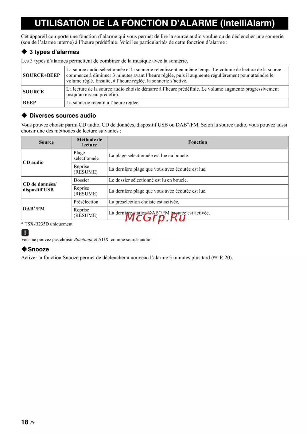 Cet appareil comporte une fonction d’alarme qui vous permet de lire la source audio voulue ou de déclencher une sonnerie