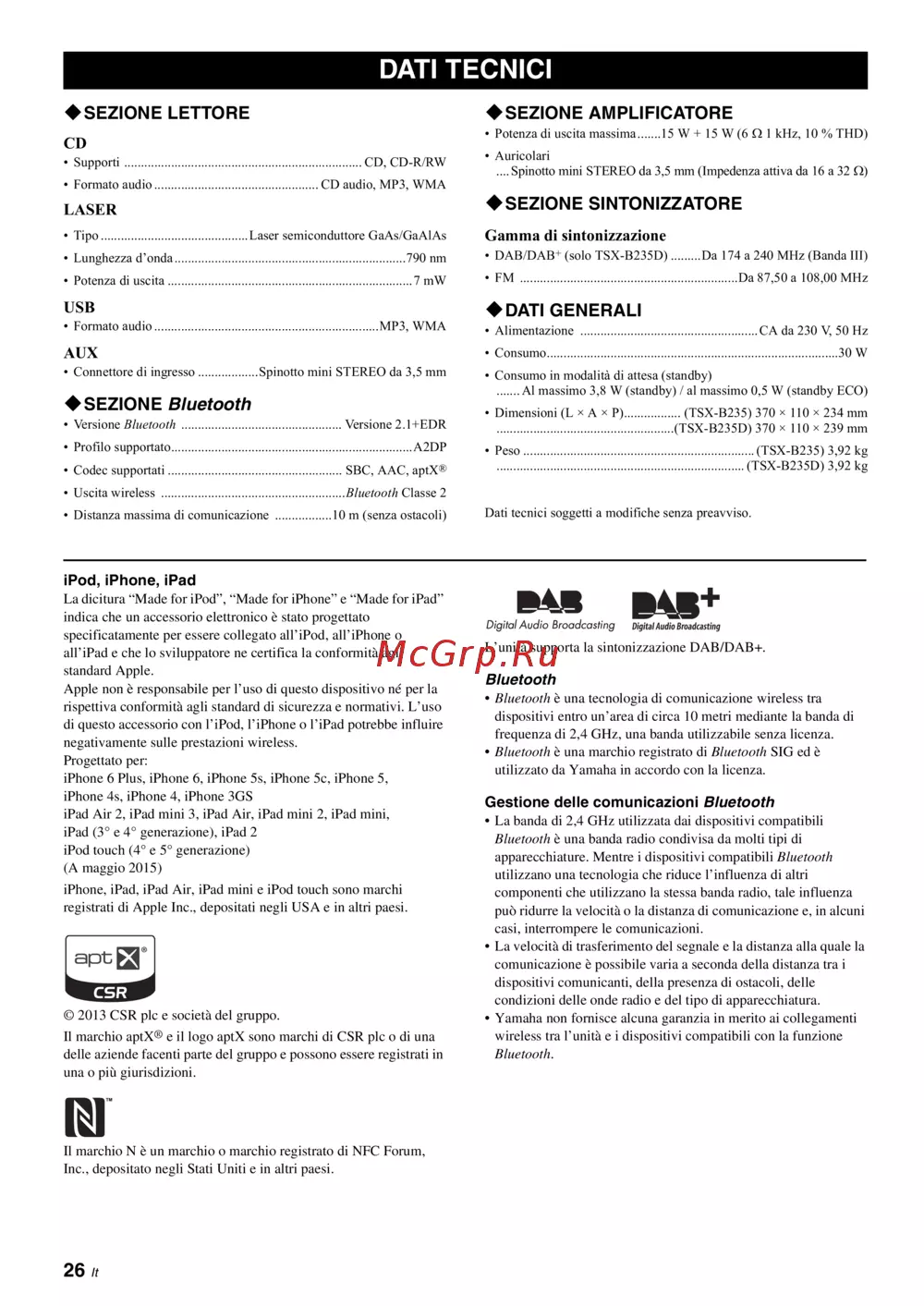 Yamaha TSX-B235 White — технические характеристики аудиосистемы с Bluetooth и CD [140/227]