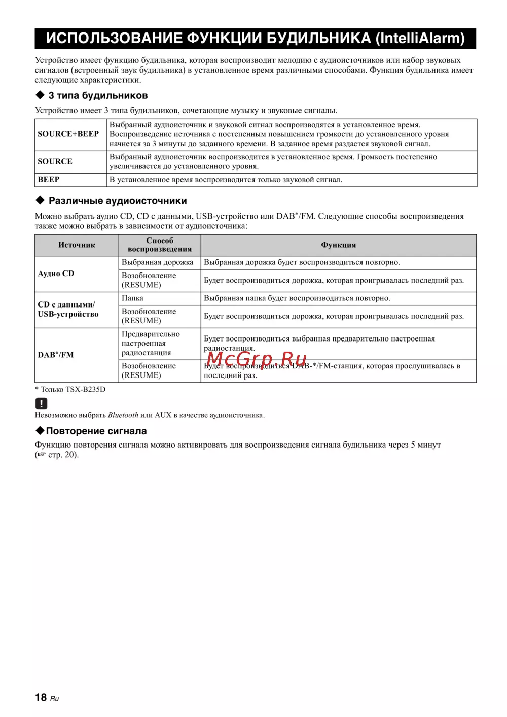 - Устройство имеет функцию будильника которая воспроизводит мелодию с аудиоисточников или набор звуковых сигналов встроенный звук будильника в установленное время различными способами функция будильника имеет следующие характеристики p.216
