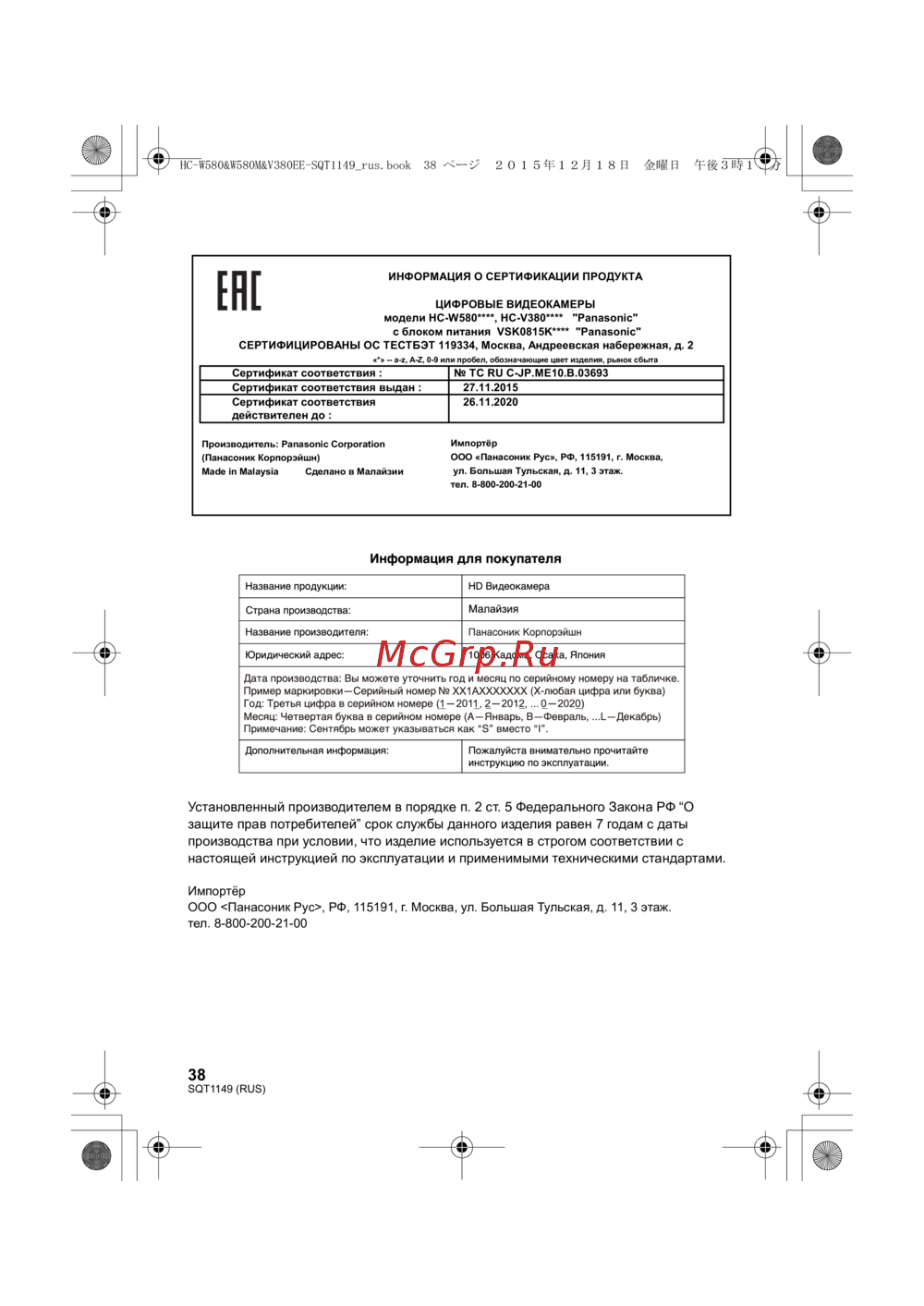 ![Panasonic HC-W580EE-K [38/40] Установленный производителем в порядке п 2 ст 5 федерального закона рф о защите прав потребителей срок службы данного изделия равен 7 годам с даты производства при условии что изделие используется в строгом соответствии с настоящей инструкцией по эксплуатации и применимыми техническими стандартами](/views2/1272680/page38/bg26.png)