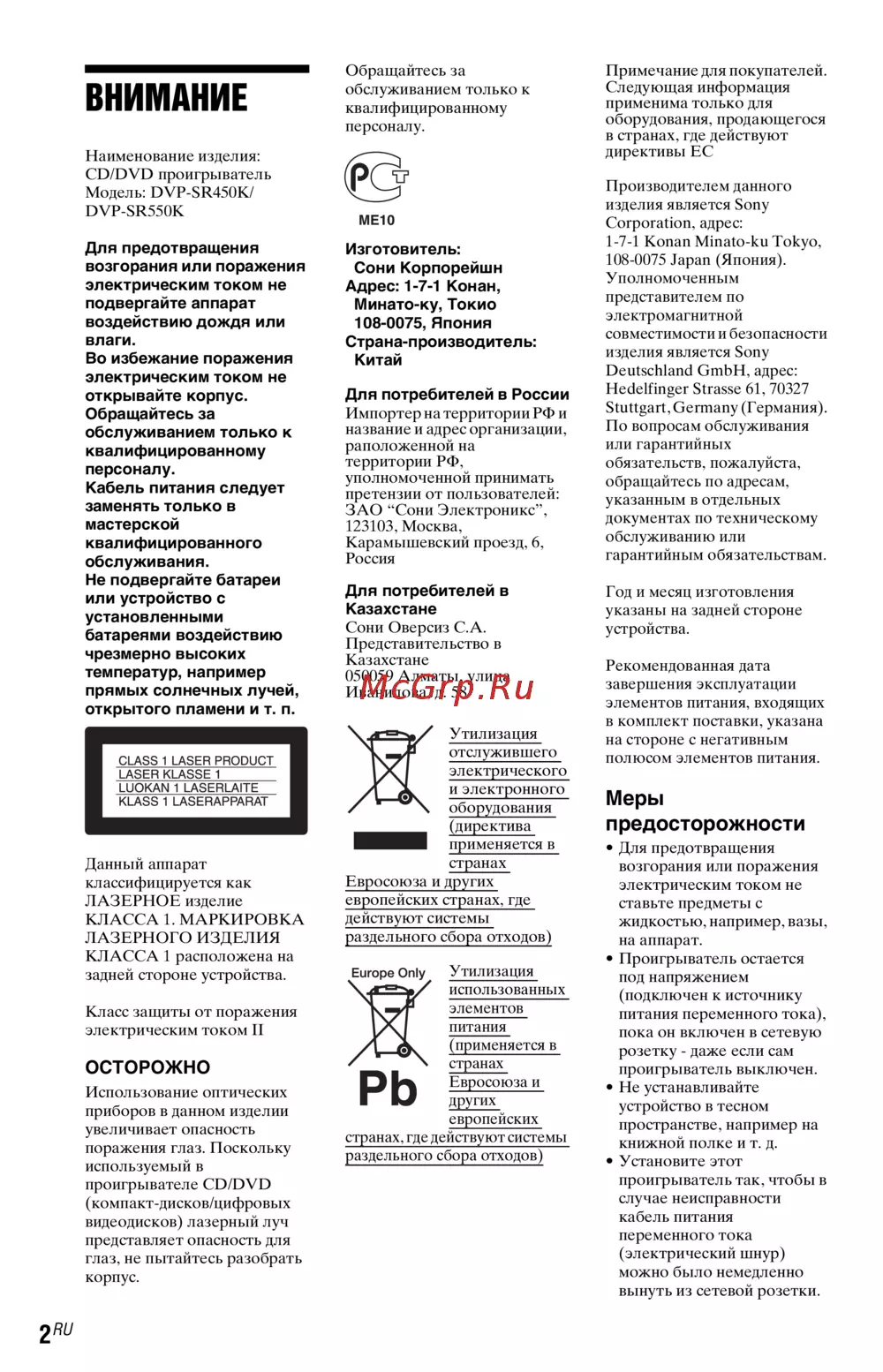 Sony DVP-SR550KB — cD/DVD проигрыватель: инструкция по эксплуатации и мерам безопасности [2/44]