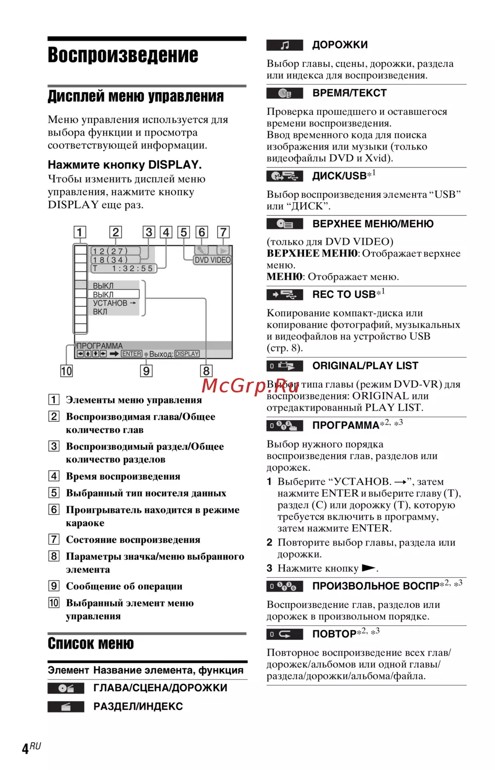 Sony DVP-SR550KB — меню управления воспроизведением: функции и настройки [4/44]