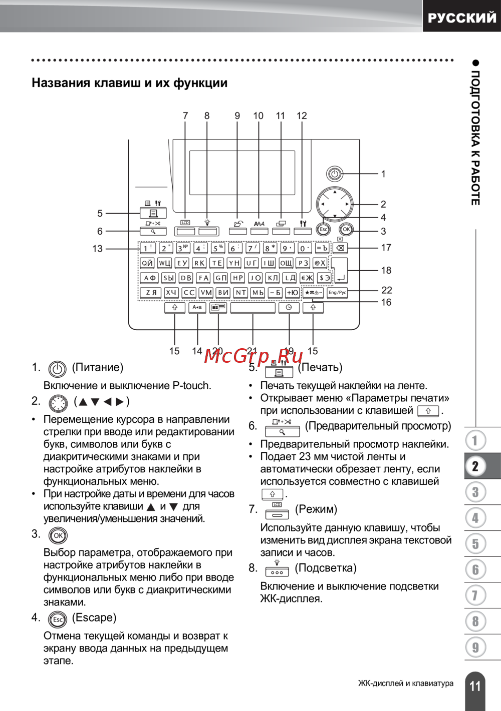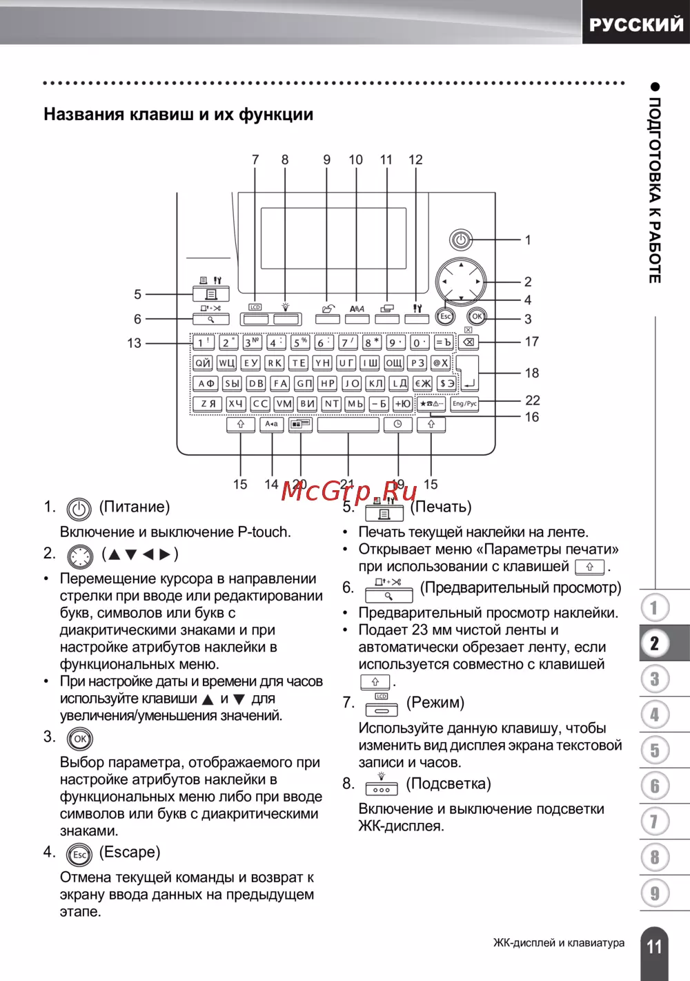 Brother PT-2700 — подготовка к работе с ЖК-дисплеем и клавиатурой устройства [13/82]