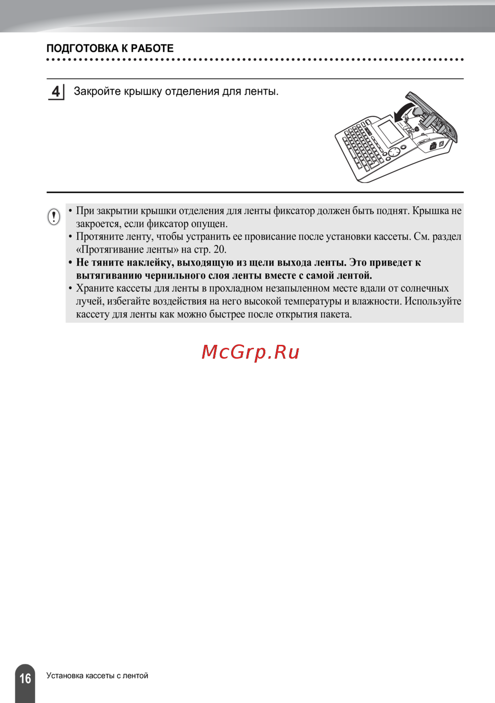 • При закрытии крышки отделения для ленты фиксатор должен быть поднят. Крышка не