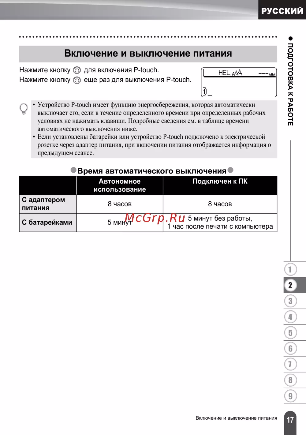 • Устройство P-touch имеет функцию энергосбережения, которая автоматически
