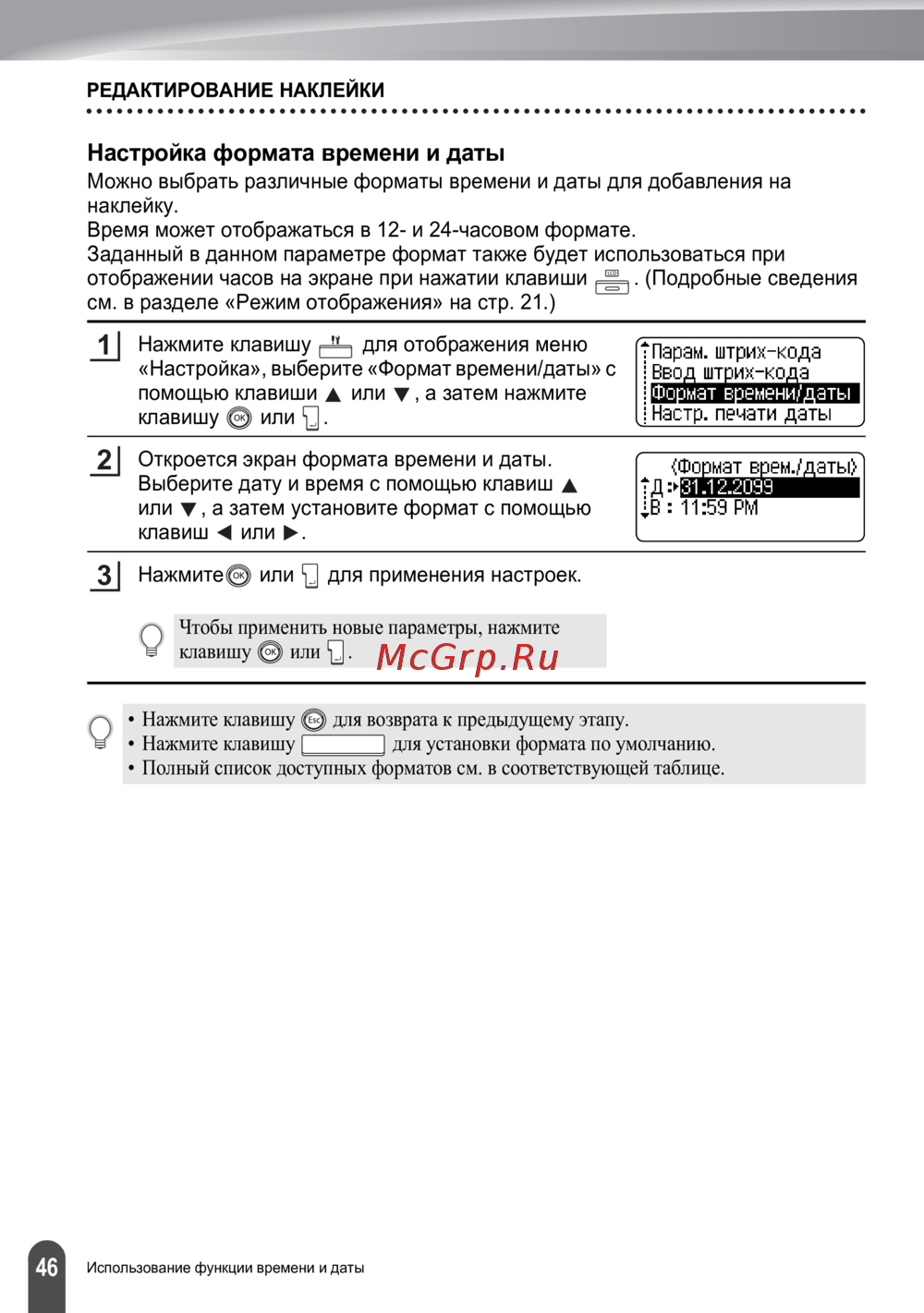 Brother PT-2700 — настройка формата времени и даты для наклейки [48/82]
