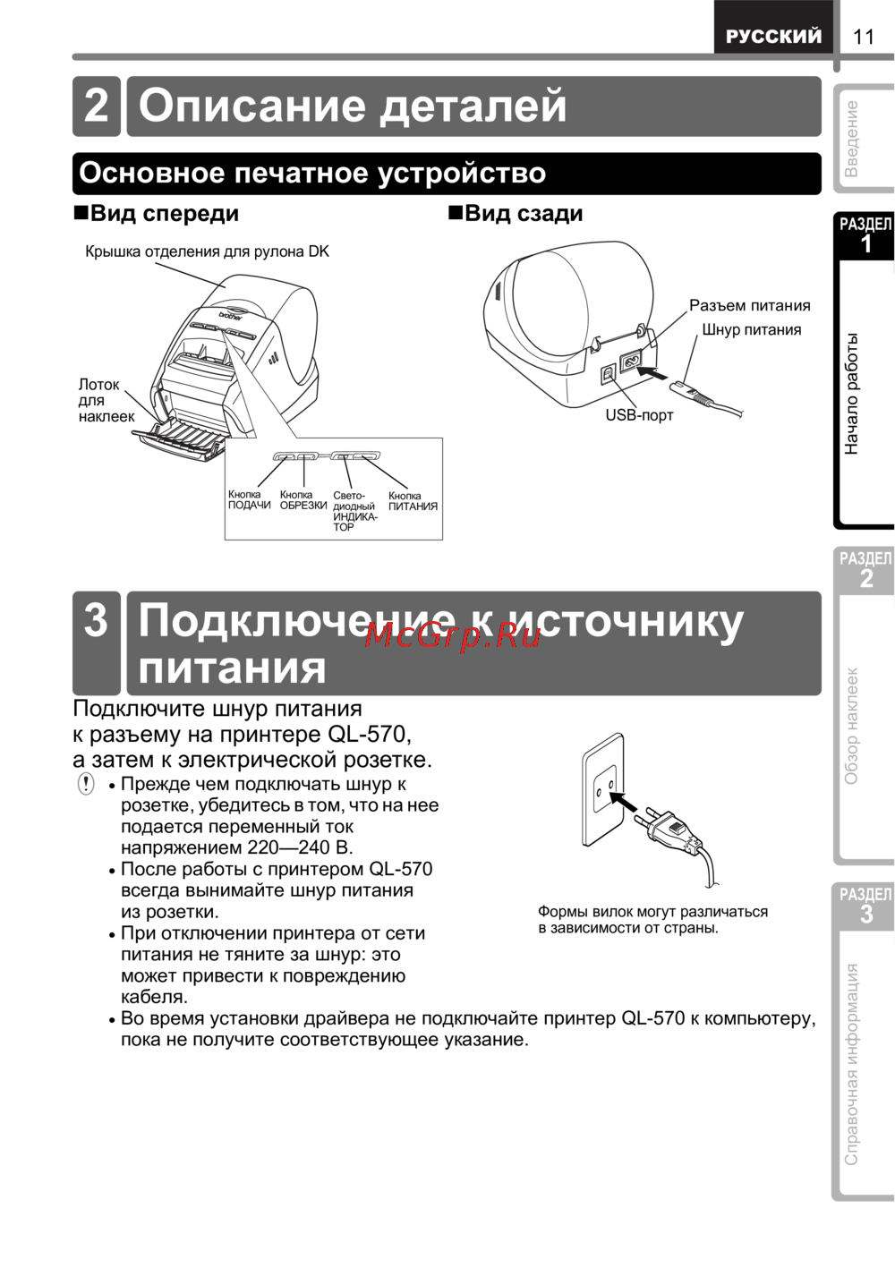 - Подключите шнур питания к разъему на принтере ql 570 а затем к электрической розетке p.15