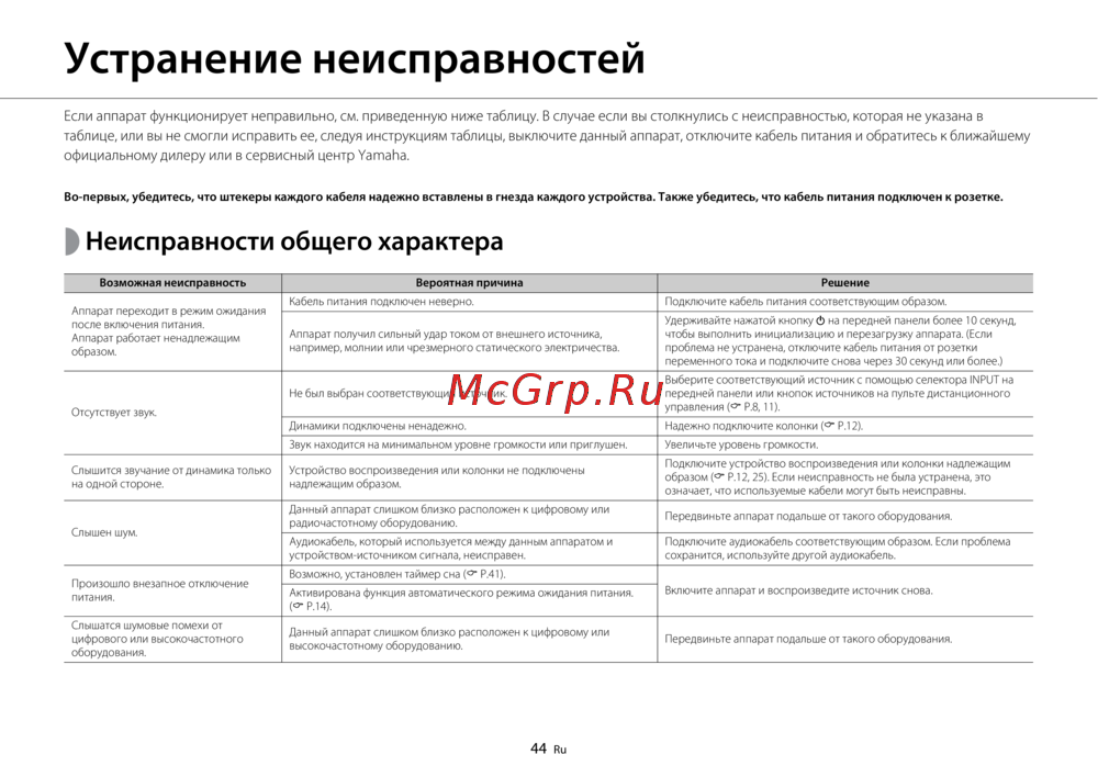 - Если аппарат функционирует неправильно см приведенную ниже таблицу в случае если вы столкнулись с неисправностью которая не указана в таблице или вы не смогли исправить ее следуя инструкциям таблицы выключите данный аппарат отключите кабель питания и обратитесь к ближайшему официальному дилеру или в сервисный центр yamaha p.44