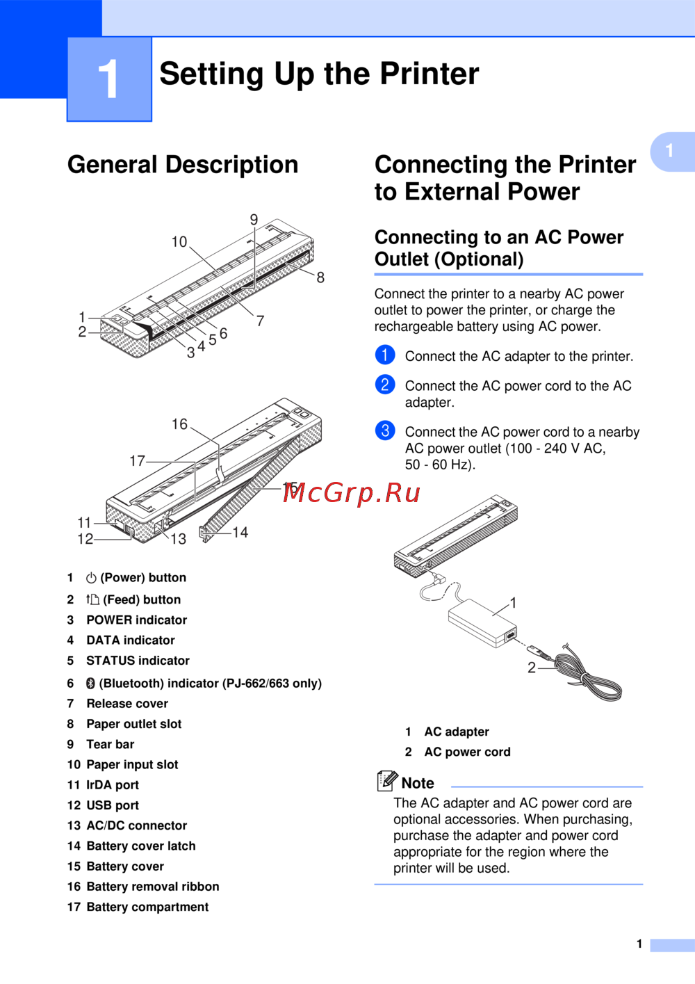 - The ac adapter and ac power cord are optional accessories when purchasing purchase the adapter and power cord appropriate for the region where the printer will be used p.5
